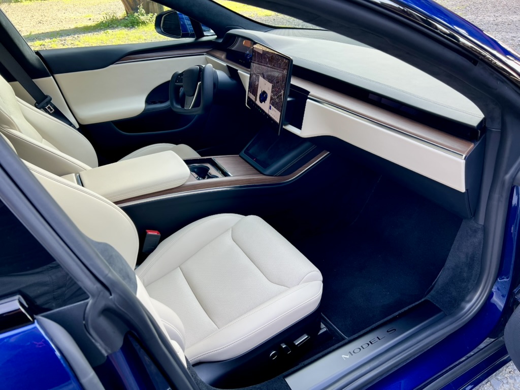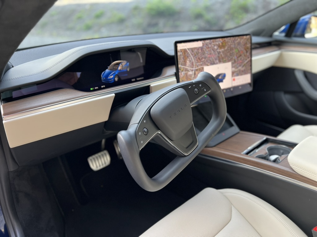 Yoke volant, autopilot, automatické řazení pruhů, automatické parkování. Auto se řídí samo na dálnici i ve městě. Já jen dohlížím a kontroluji.